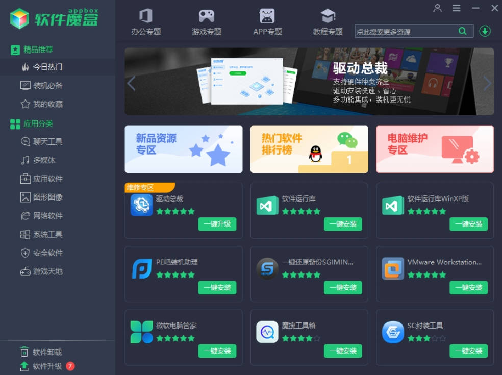 软件魔盒最新版是一款集成了多种实用工具的软件管理工具箱,它收录了上千款常用软件和系统工具,用户可以通过它快速安装和管理电脑软件,同时还提供了系统优化和垃圾清理等功能,并集成了系统修复和驱动管理等实用功能模块,感兴趣的话快来下载吧。
