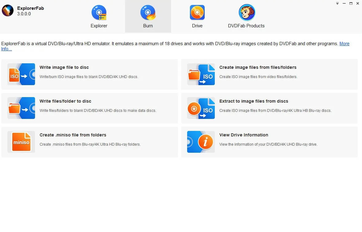 ExplorerFab最新版是一款功能强大的文件管理工具软件,该软件使用户能够快速地从文件或文件夹创建ISO文件,并能将文件刻录到光盘上,同时还支持模拟多达18个虚拟驱动器用于挂载DVD或蓝光ISO文件,感兴趣的话就下载试试吧。