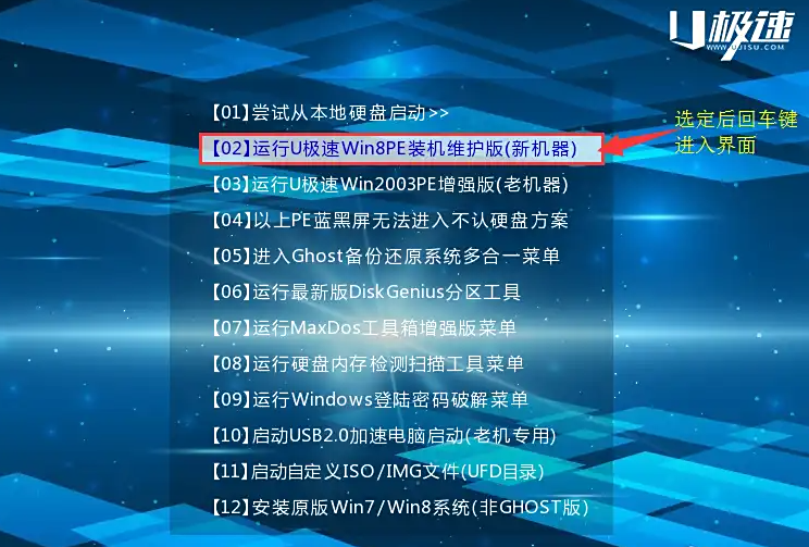 1、首先我们需要进入u极速制作的u盘启动窗口,选择运行装机维护版。