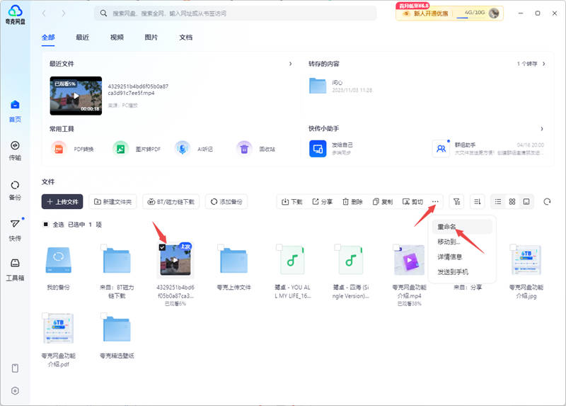 1、在本站下载夸克网盘pc版,打开软件,找到要改名的文件,点击选中,点击右上角的三个点,点击重命名。