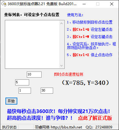 2、使用软件时,您只需将鼠标移动到目标位置,按下Ctrl+Q设定左键点击或Ctrl+W设定右键点击,然后按开始键执行,程序便会自动记录坐标并进行连点。