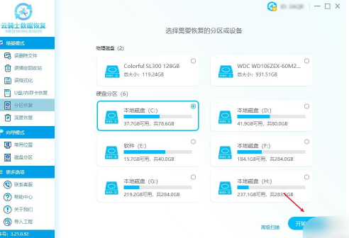 2、接着选择需要恢复数据的分区,随后进行扫描。