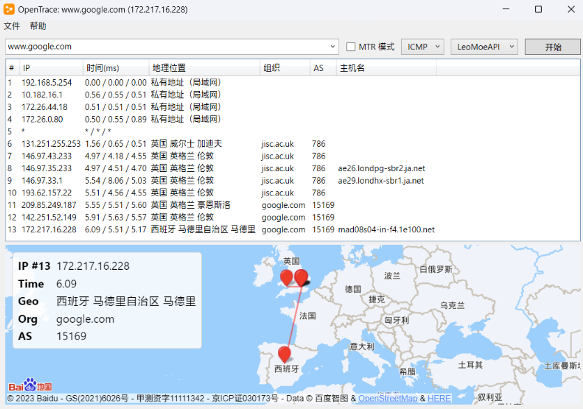 Opentrace路由追踪工具是一款免费轻量的路由追踪软件,如果用户不知道IP对应的地理位置是哪里的话不妨打开该软件试试。软件会将地理位置和当地的时间等都显示出来,此外还内置了全球地图,方便用户了解详情。