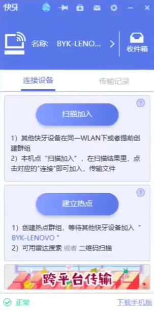 1、进入软件之后打开热点,然后让另一台设备的快牙进行连接。