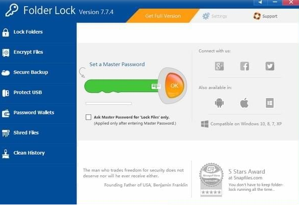 Folder Lock是一款考研主用户对文件进行加密和隐藏的软件,使用起来非常的方便,可以轻松进行加密和操作,帮会用户更好的去使用,来解决各种不同类型的问题,能够满足各种不同的需要,感兴趣的小伙伴快来下载试试吧!