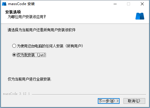 1、打开软件安装包,然后选择仅为我安装;