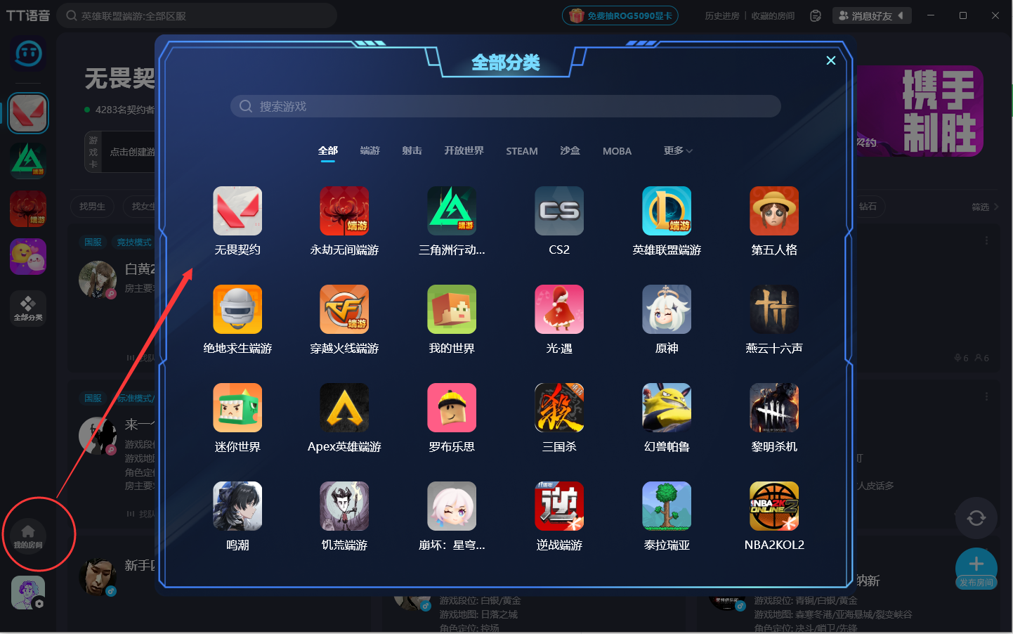 2、游戏开黑房间:根据玩家段位和区服会细分好多房间,快加入自己能玩的房间。