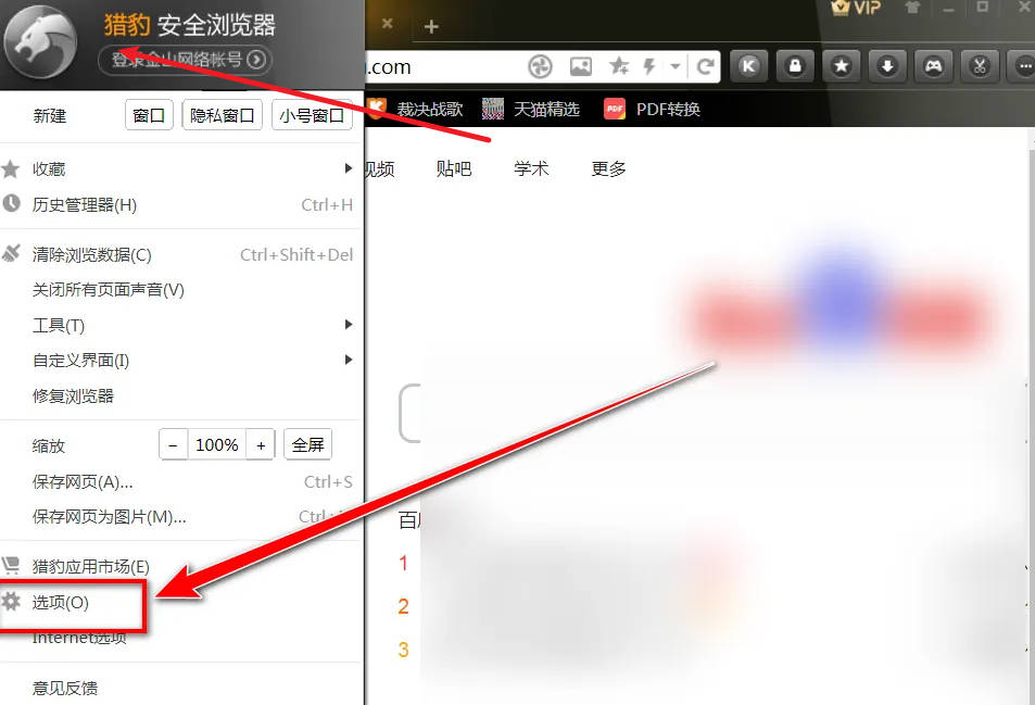 1、在本站下载并安装猎豹安全浏览器官方免费下载安装,打开软件,点击左上角的猎豹图标,点击选项。