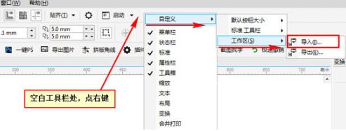 1、打开CorelDRAW,在工具栏进行邮件选择自定义工作区中的导入。