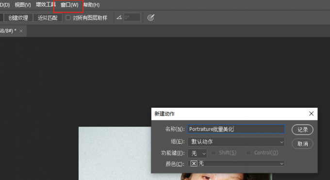 1、在ps中打开一张图片,选择窗口-动作-新建动作-记录。
