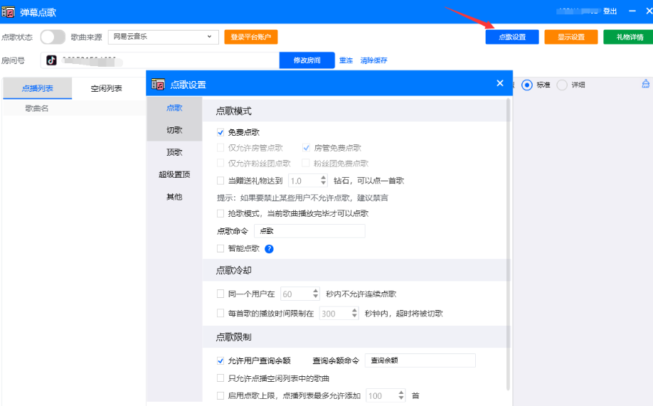 2、然后在其中的点歌冷却这里设置点歌时间。