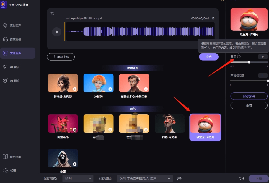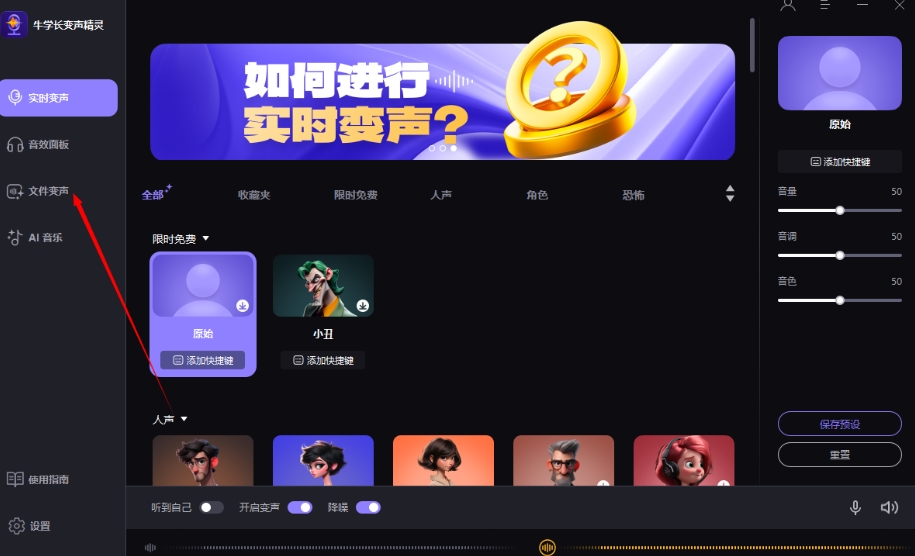 1、启动后选预设音效,拖动音调滑块实时变声并试听。