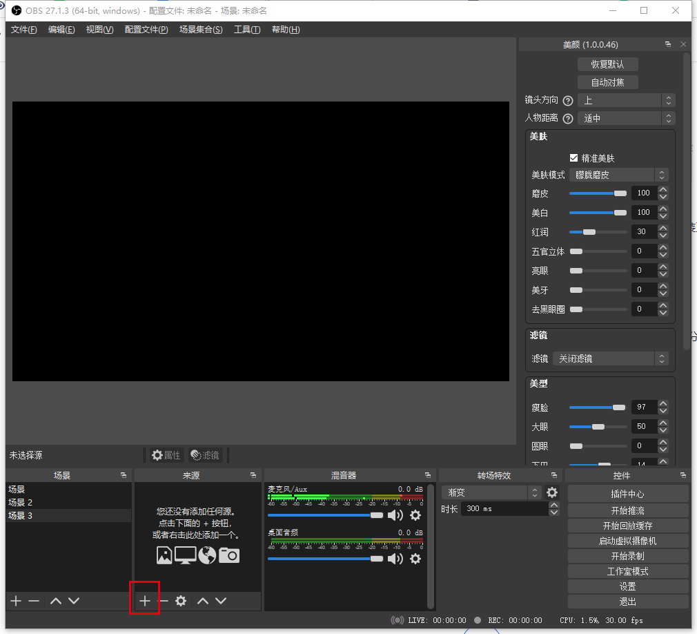 1、点击obs软件中的+号。