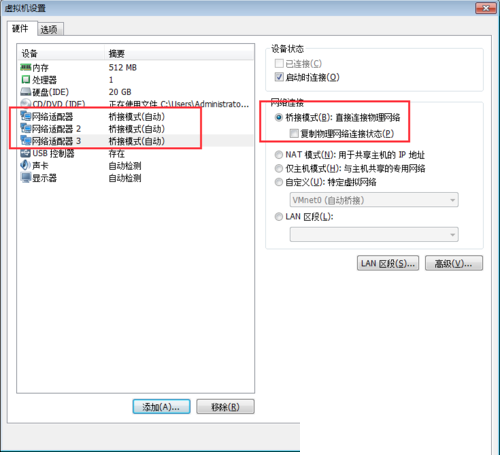 2、Pa需要配置 3 块网卡,因此我们还需添加两个网络适配器。点击【添加】→ 选择【网络适配器】→ 点击【下一步】→ 选择【桥接模式】→ 点击【完成】→ 最后点击【确定】保存设置。