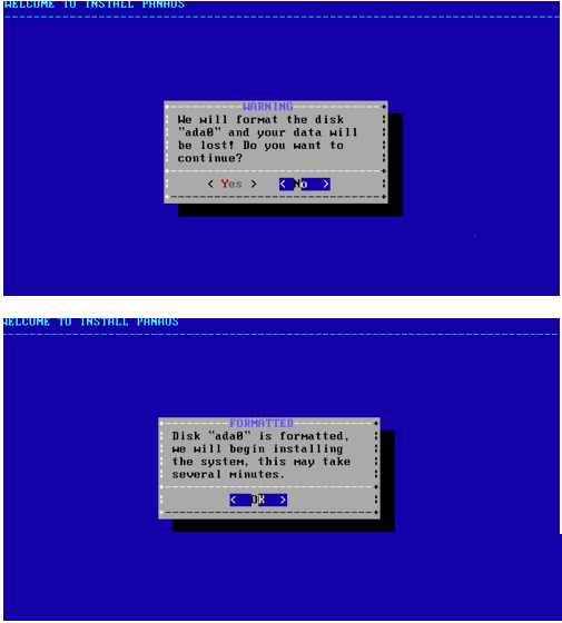 7、接下来会提示即将格式化硬盘,是否继续,选择 “yes”,随后点击 “OK” 继续。