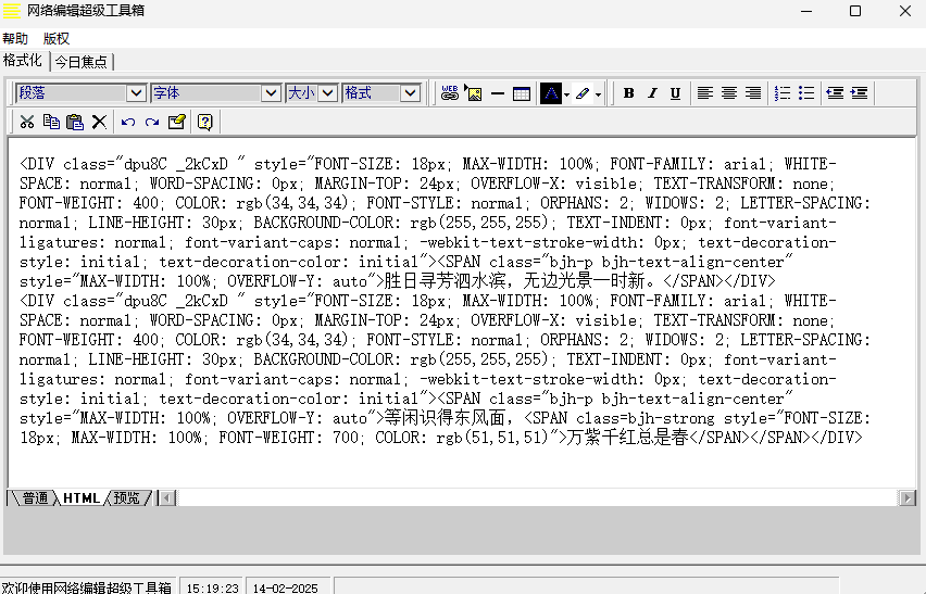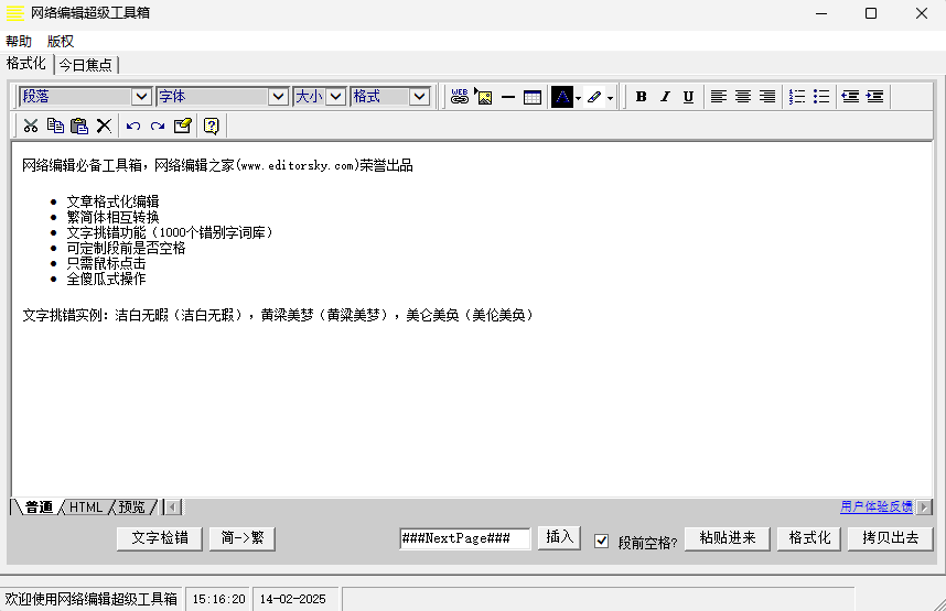 网络编辑超级工具箱是一个非常好用的文字排版应用,它会将文档中很不看见的隐藏格式都清楚,确保它是一个纯文本,这样就方便我们复制粘贴了,不会出现乱码问题,除了文字外,图片和表格也可以编辑,功能十分强大。