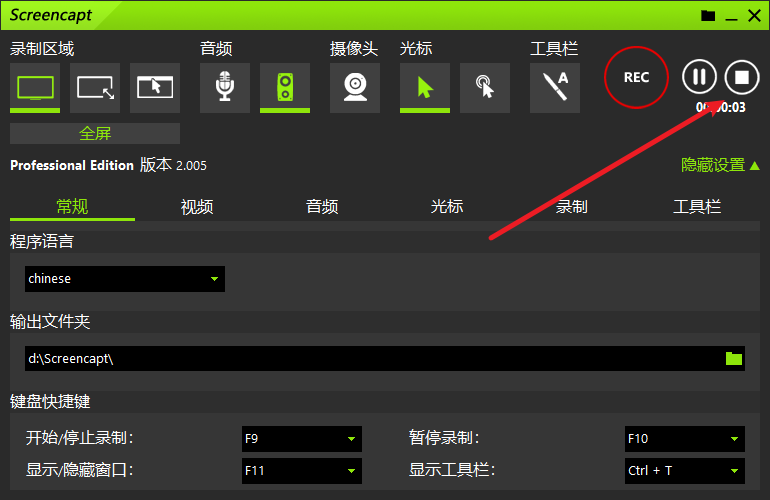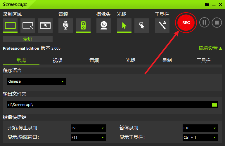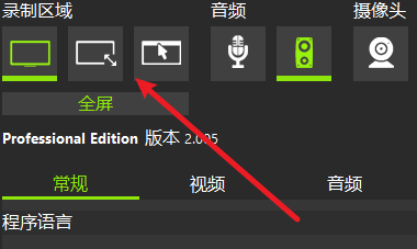 1、首先打开软件,选择软件的录制区域、音频和摄像头等功能。