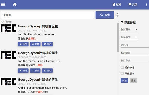 找到目标台词后,可以预览该台词在影片中对应的实际画面场景。