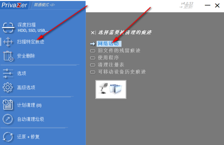 1、打开软件,选择左侧的扫描特定痕迹,接着在右侧选择网络活动。