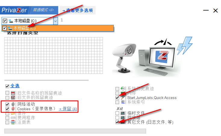 2、接着点击上方的本地磁盘,选择网络活动痕迹保存的位置,随后对部分选项进行设置。