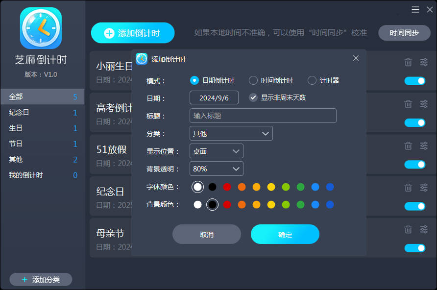 2、使用该软件时,用户可通过点击“添加倒计时”按钮设置目标日期和时间,并可自定义标题、分类及桌面显示的视觉效果,操作简单直观。