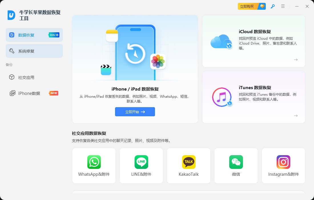 牛学长苹果数据恢复工具电脑版是一款专业安全的数据救援软件,支持iPhone和iPad设备数据扫描与恢复,可找回误删或丢失的照片视频、联系人信息等,操作简单无需复杂技术,兼容最新iOS系统,无需越狱即可使用,接下来就帮助大家了解牛学长苹果数据恢复工具的功能及使用方法。