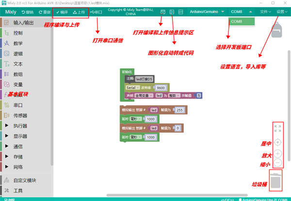 爱上米思齐mixly是一个非常好用的图形化编程软件,它没有花里胡哨的页面,左侧是各种功能模块,上方是工具栏,中间就是一大块可供编辑的区域了,将模块拖动到页面上,这样就可以生成一个事件了,点击转换按钮,还可以把模块转化为代码语言。