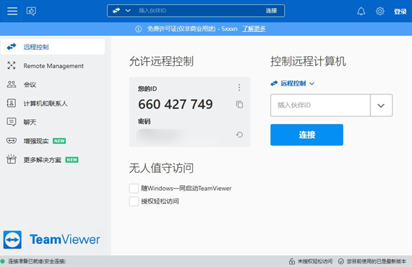 TeamViewer个人免费版是一款能够帮助用户来对用户进行远程控制的软件,同了相当优质的远程共享和传输的效果,可以解决各种不同的操作功能,带来了相当优质的连接功能,可以更好的进行使用,为用户们提供了优质的操作效果,可以轻松进行使用,快来下载试试吧!