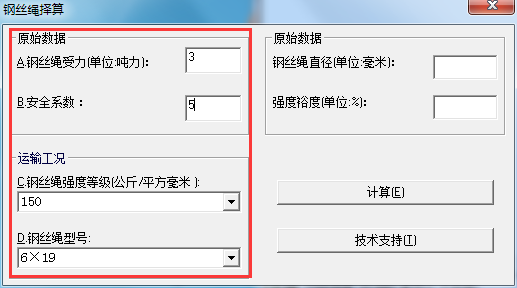 1、录入钢丝绳规格参数,选定安全系数与工况条件。