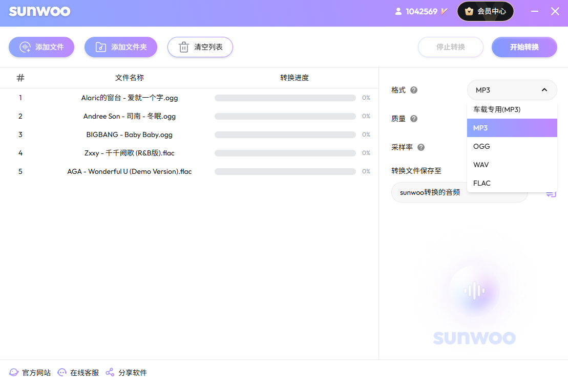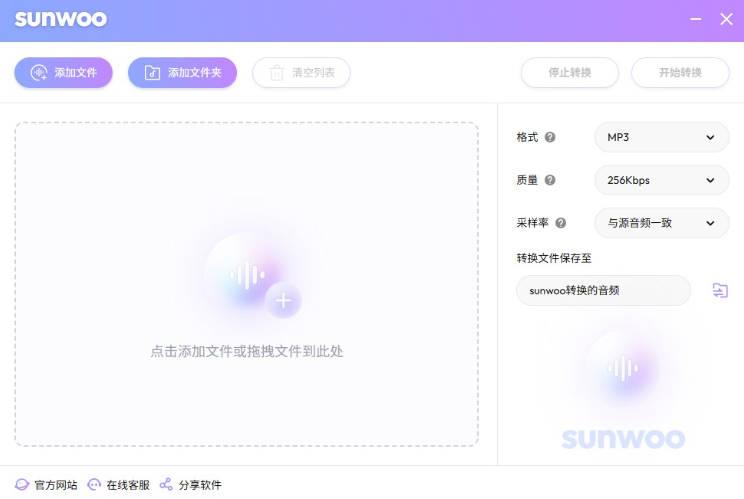 sunwoo软件是一款专门用于进行音频处理的优质工具,用户可以在这款软件当中更加便捷式的进行音频上传,然后将其音频格式可以转换为自己需要的,使得其音频格式能够因此变得更加适合自己,非常的实用。