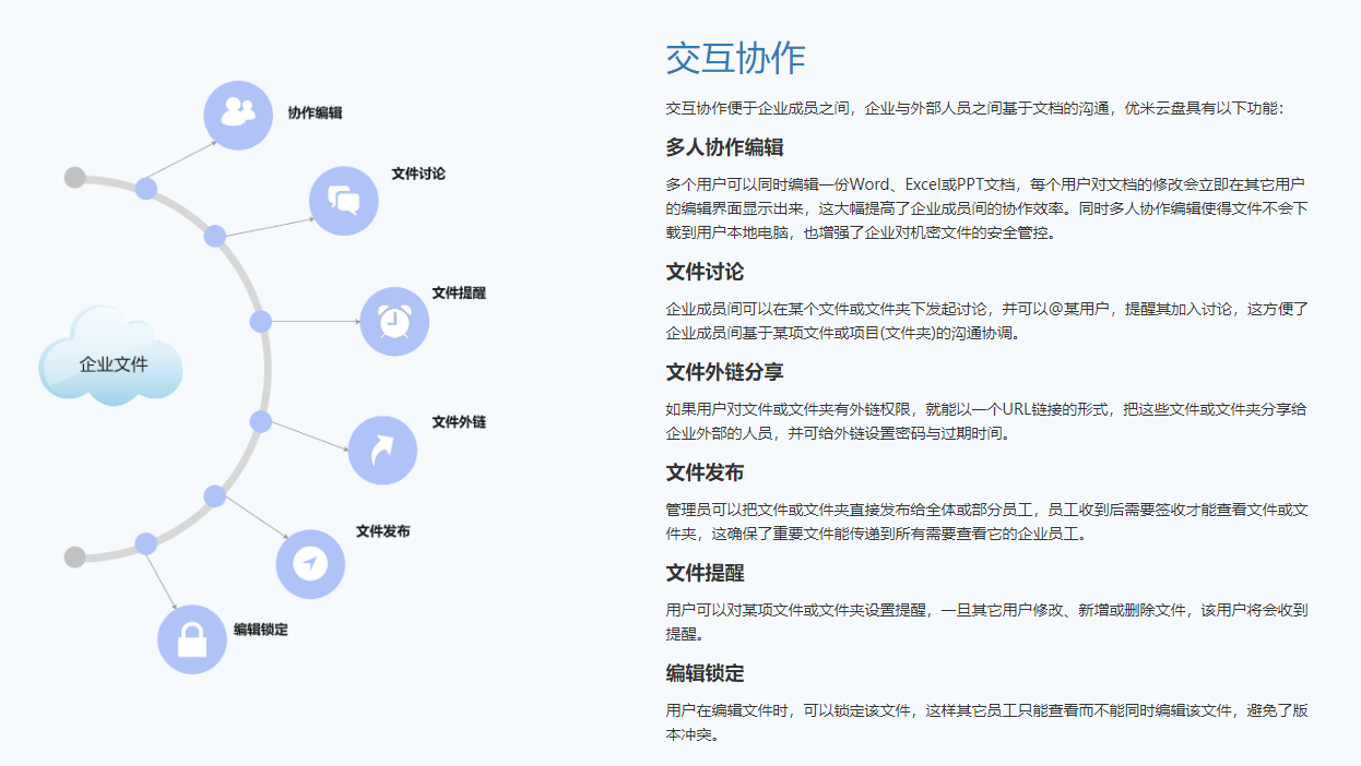 优米云盘免费版是企业应对文件管理的理想选择工具,它提供API接口,可以集成到企业内网中使用,管理员再根据企业特性进行优化调整,这样就可以打造专属工作流了,员工们可以用它来编辑传输文件,提高工作效率。
