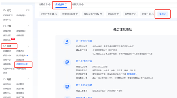 1、关店步骤:申请关店、确认身份、达成关店条件、签署协议、资金退回。