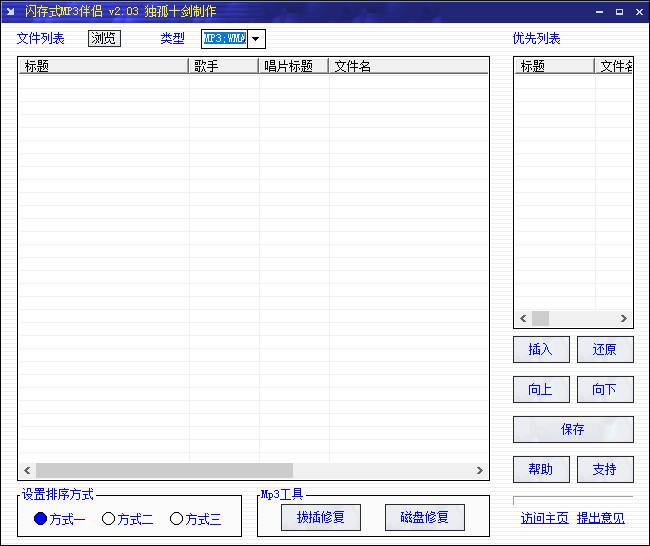 闪存式MP3伴侣官方版是一款支持多种自动排序方式且整理速度超快的MP3文件管理软件,其重新设计的算法能快速调整MP3设备中的歌曲顺序,并附带解决设备无法安全弹出等常见问题的小工具,方便用户使用,下面一起来看看吧。