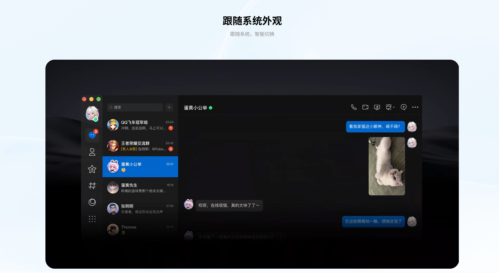 三栏布局,左边会话,中间气泡,右边资料,支持深色/浅色自动跟随系统,深夜刷群不再亮瞎眼。