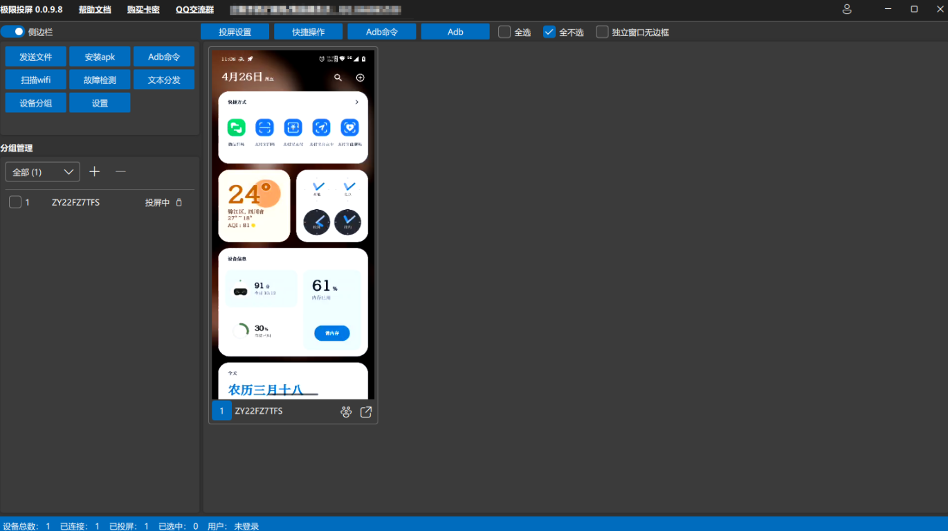 极限投屏助手是一个高性能安卓设备管理工具,大家可以在电脑上统一管理多台安卓手机,对它们进行故障检测、文本分发、安装apk等操作,安卓手机的页面也会实时在电脑上显示出来,无需盯着手机,只要看电脑屏幕就可以操作了。