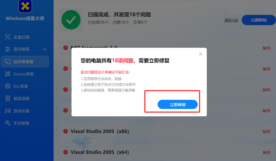 1、多种修复:不仅支持智能修复的模式还支持手动修复,用户能手动修复各种dll文件。