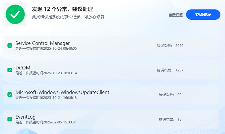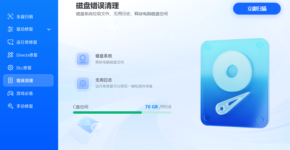 1、打开软件,选择左侧的错误清理,点击立即扫描。