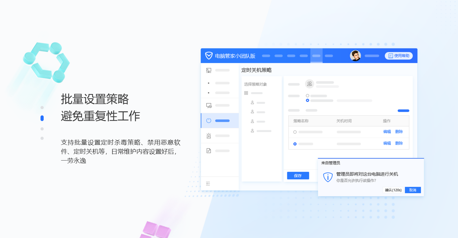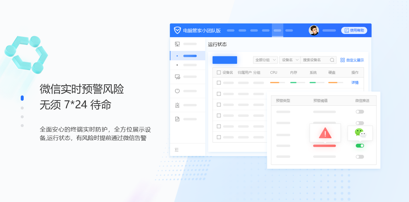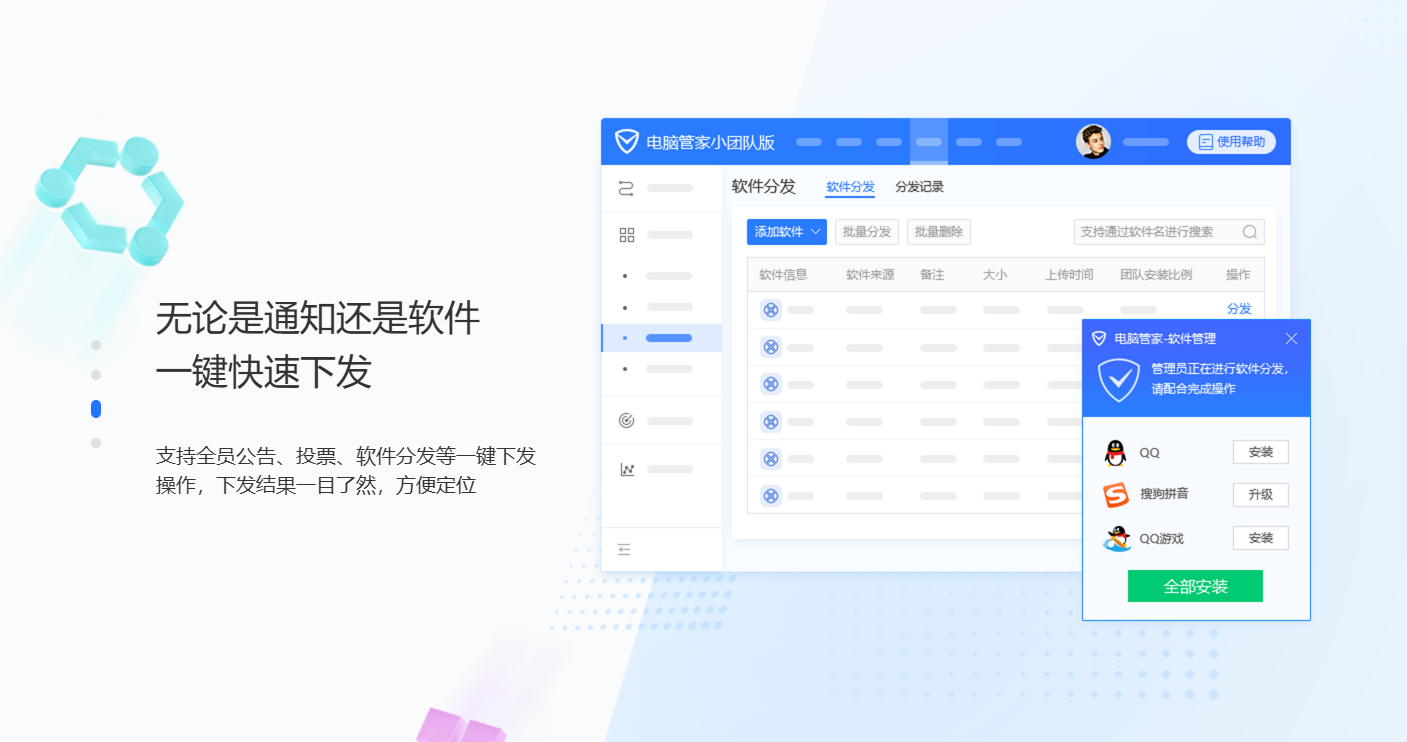 腾讯电脑管家小团队版是一款专门为工作人员打造的工具,该软件在原本的腾讯电脑管家功能的基础上添加了许多全新的功能。从团队软件分发再到远程协助等功能全面覆盖,使用期间有遇见问题还能打开使用教程寻求帮助。
