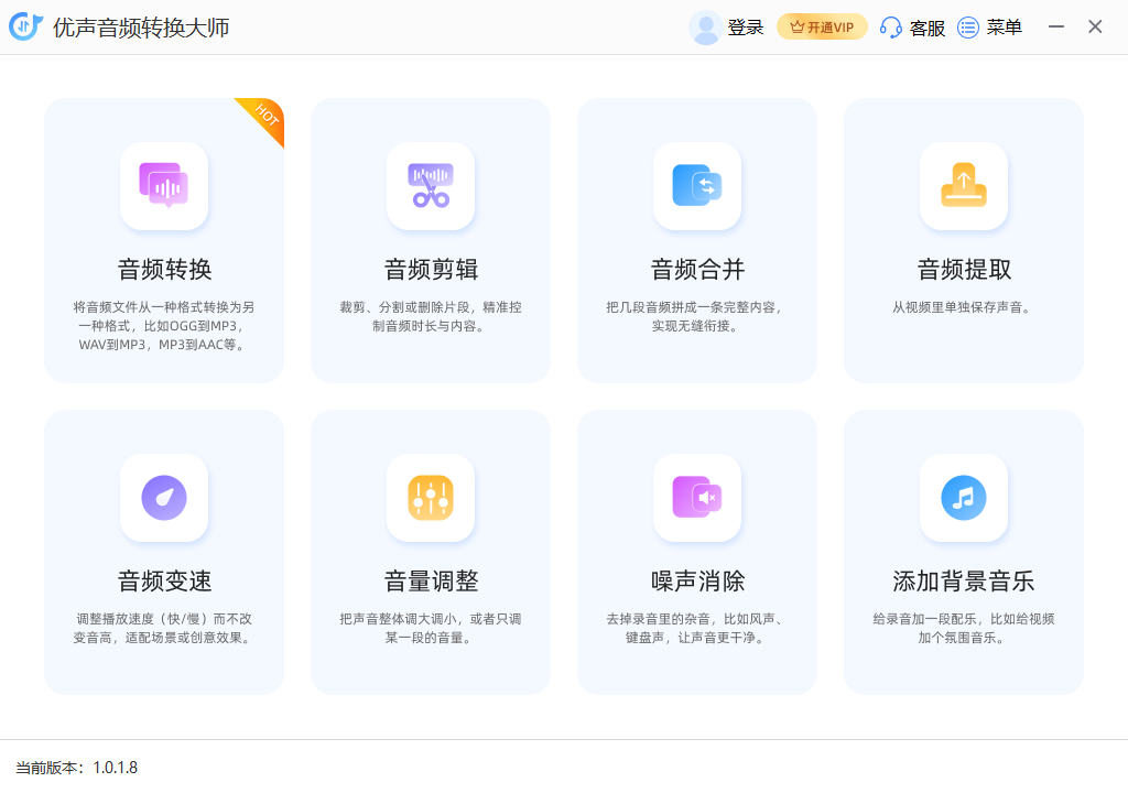优声音频转换大师免费版是一款把音频格式转换、剪辑、批量处理等功能全部集成在同一界面的全能音频处理工具,帮用户把音乐、有声读物、录音等素材快速转换格式、精准剪辑片段,一台电脑就能搞定音频处理全流程,需要音频转换或剪辑的用户可以下载试试哟!