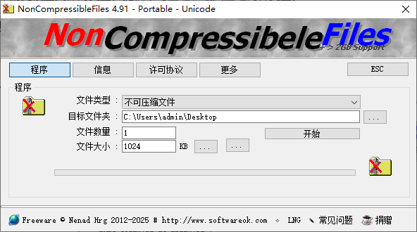 NonCompressibleFiles是一款体积小巧的文件创建工具,该软件主要是用来创建那些测试会用到的文件。用户能自己设置文件的大小和数量,快速生成文件以满足自己的需求。软件内置官方教程,非常适合新手使用。