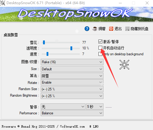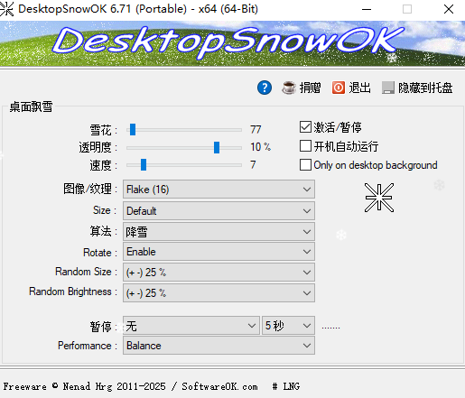 DesktopSnowOK桌面飘雪是一款深受用户喜欢的电脑桌面美化工具,这款软件当中提供了非常有趣的飘雪特效可以在自己的电脑桌面当中呈现出来,使得能够让自己的电脑桌面因此变得更加好看,用户可以沉浸式的体验到。