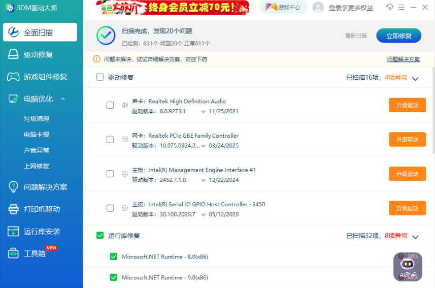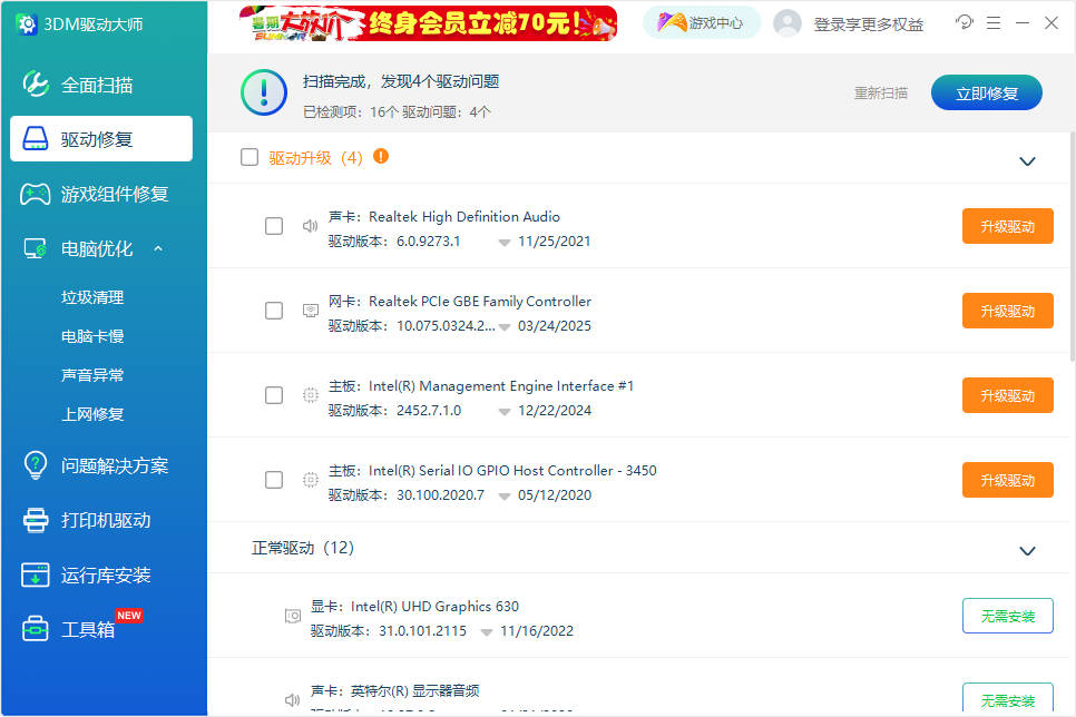 3dm驱动大师万能驱动是一款专门用于进行电脑系统优化的强大工具,这款软件当中所提供的功能非常丰富,用户可以借助这款软件来对自己的电脑驱动进行升级管理,同时还能够选择喜欢的驱动继续优化,非常的方便。