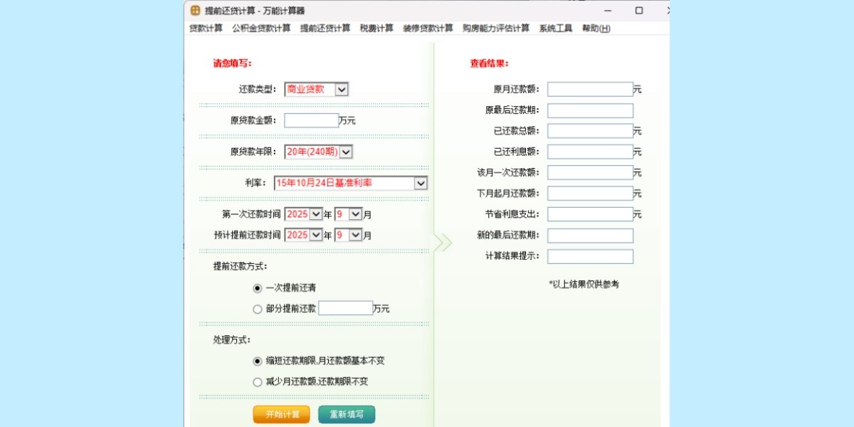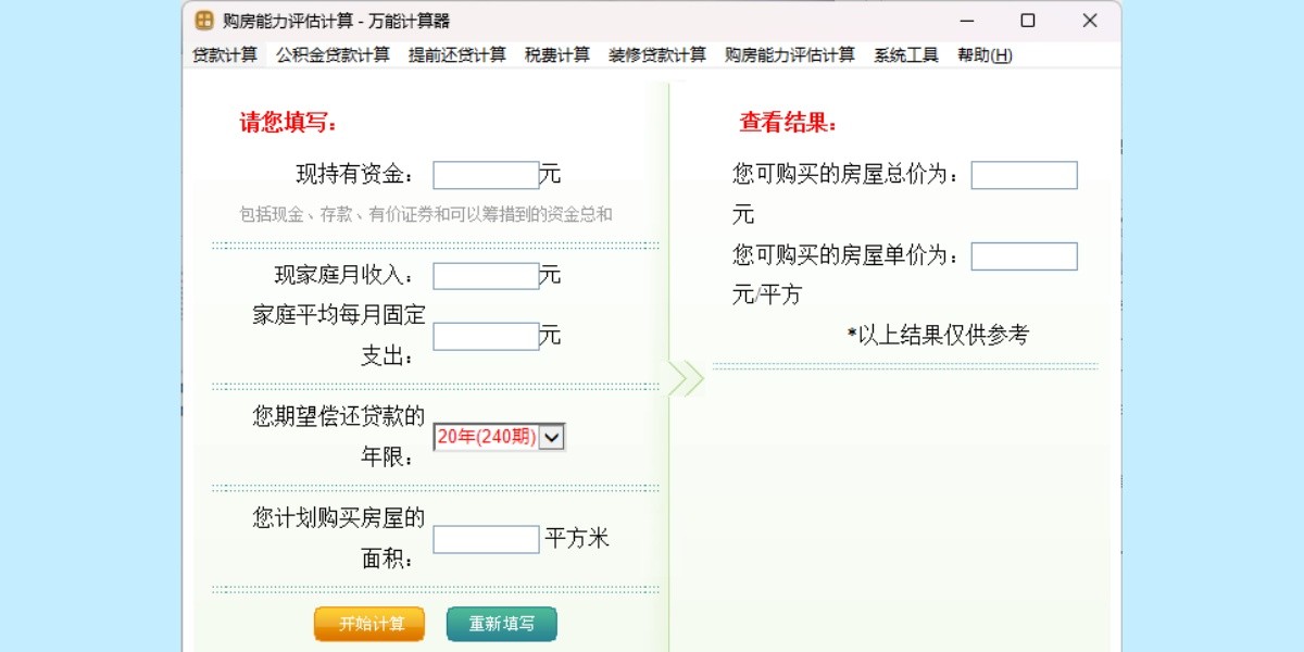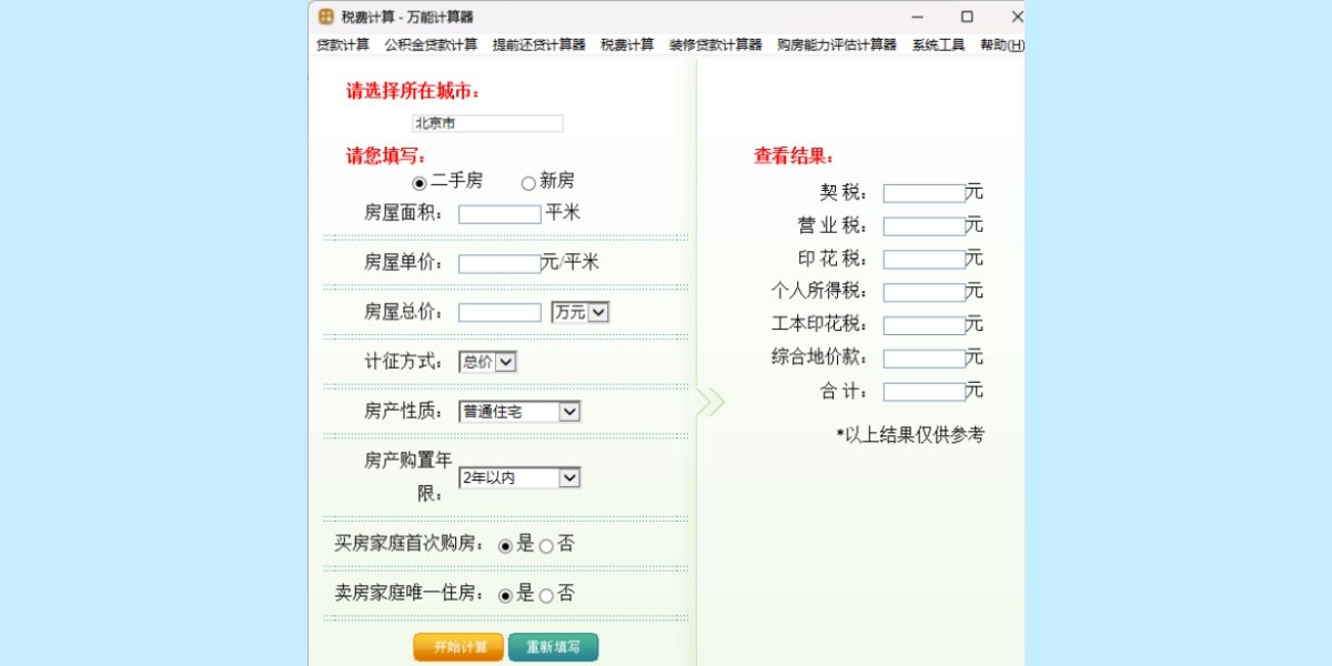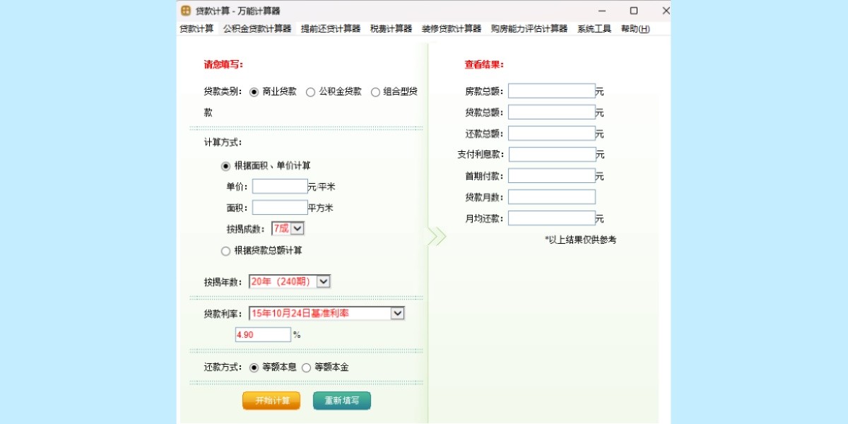 集成房贷计算器、个税计算器、五险一金比例查询及人民币大写转换功能。
