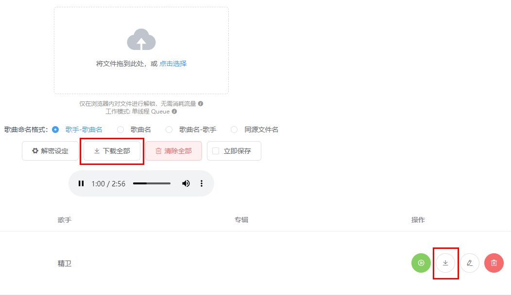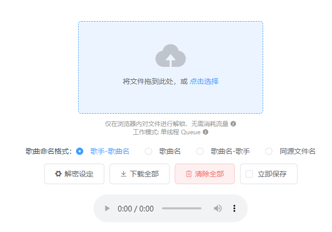 unlock music在线转换是一款专门用来解锁音乐的工具,如果当前的设备上有存在加密的音乐话就能使用该软件来解锁。软件会自动检测加密的类型并一键解锁,无需用户进行任何复杂操作。此外还支持在线试听,功能十分强大。