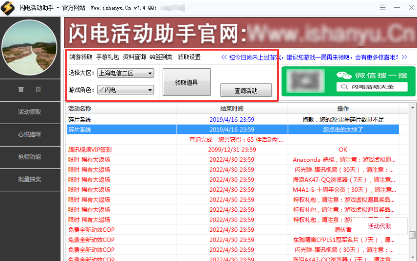 1、先在闪电活动助手最新版软件当中登录自己的游戏账号并设置好大区和角色。