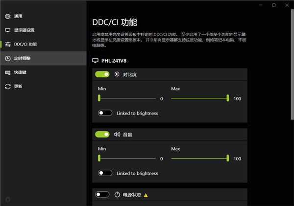 1、支持DDC/CI协议,自动识别并独立控制多台显示器亮度、对比度、音量与电源状态,滑块或滚轮即可实时同步。
