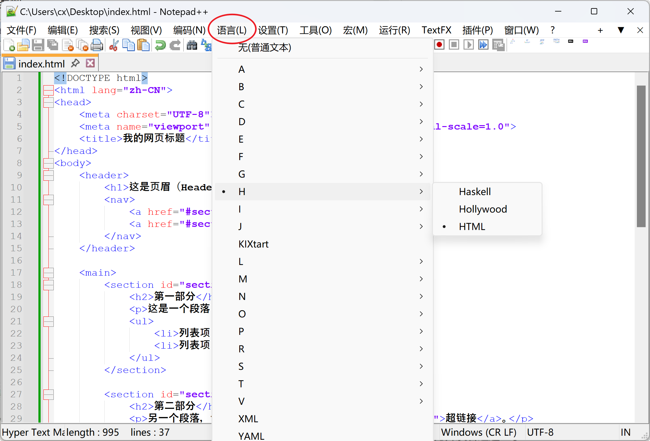 2、出现编程语言菜单栏。