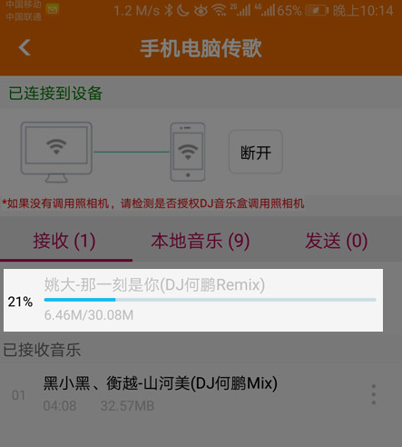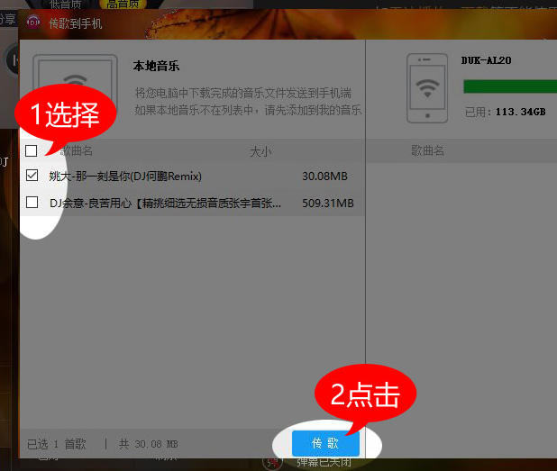 2、打开电脑本地音乐页面,勾选你要传输的歌曲,点击传歌。