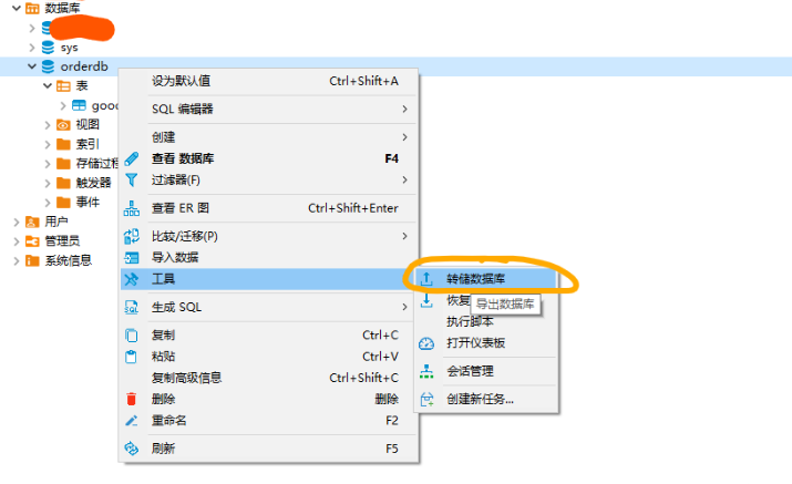 1、打开数据库连接,找到需要备份的数据库,右键数据库在工具中选择转储数据库。
