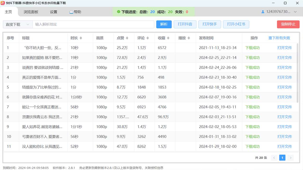 快抖下载器免费版是一款帮助用户下载短视频的工具,用户能自由导入视频链接到软件里进行下载。软件的功能十分丰富,从画质参数设置再到从软件里打开短视频平台应有尽有,在下载时还能随时暂停下载,功能十分强大。